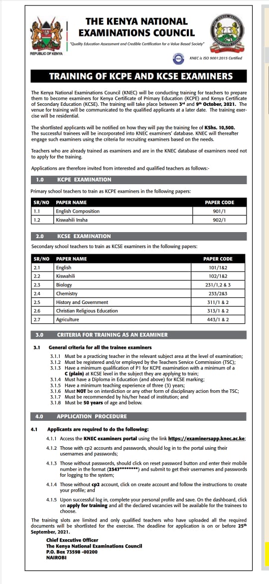 Source: For more details see; Advert for knec training of examiners in October 2021.