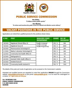 Interested applicants are expected to apply for the available MOH vacancies online through the official public service board’s website: www.publicservice.go.jke or via the jobs portal: www.psckjobs.go.ke on or before 16th April 2020 at 5.00 P.M.