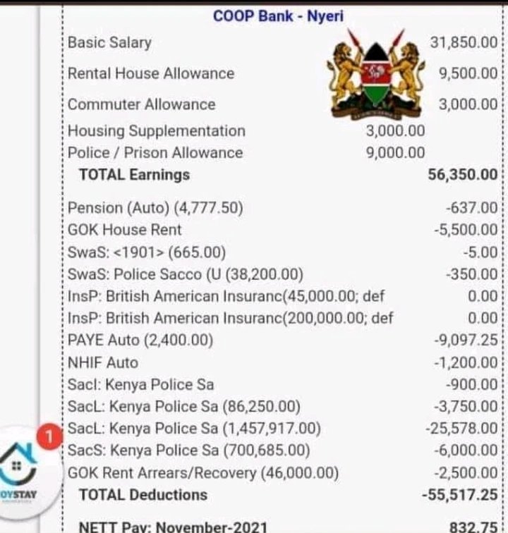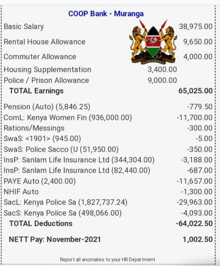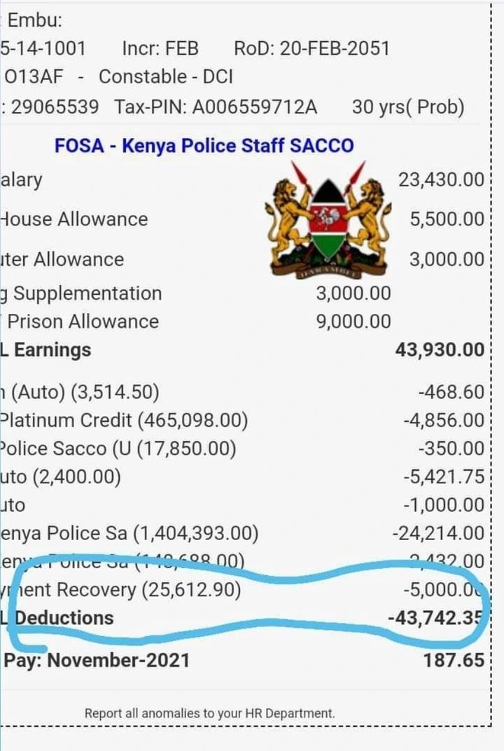 The salary pay slips for some of the affected Junior officers have now emerged.Unfortunately,some officers have had to remain with less than Ksh 1000 in their slips after the deductions.Others have got over 40,000 getting recovered leaving them with less than Ksh 200.Below are some of the slips as allegedly obtained by Dennis Itumbi: