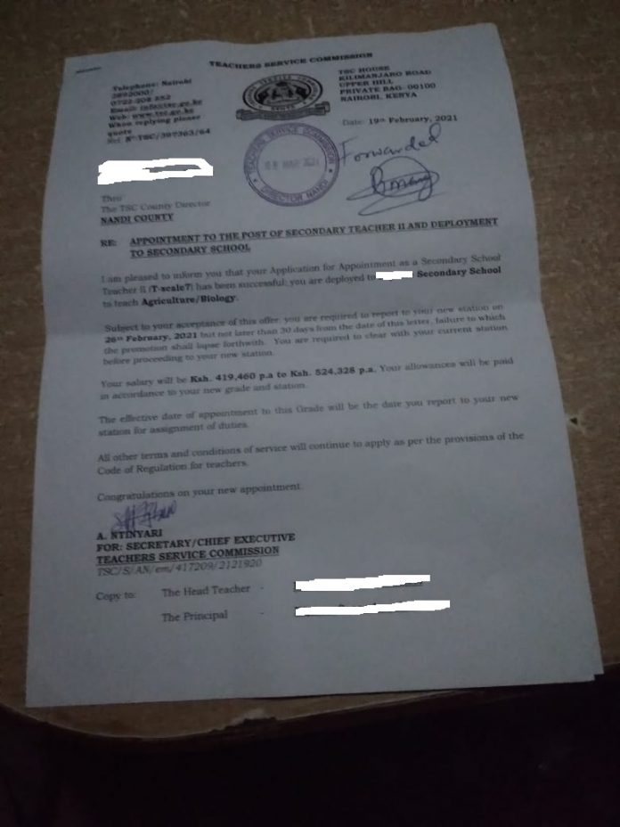 The Teachers Service Commission, TSC, issues a deployment letter to a teacher upon appointment. In deployment process a teacher is appointed to an administrative position or a higher administrative position. If you are lucky, you can be deployed to the Secretariat of the Commission.