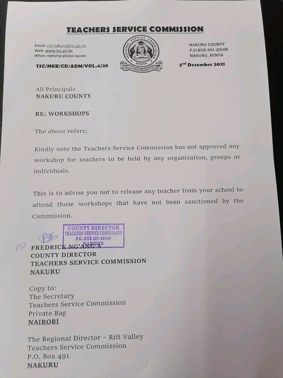 In the memo dated 2nd December 2021, the county director for education Nakuru country, has denounced the recently concluded seminar saying that his office is oblivious of what happened there since they have not approved any workshop and the heads of schools should not release tutors for these workshops.
